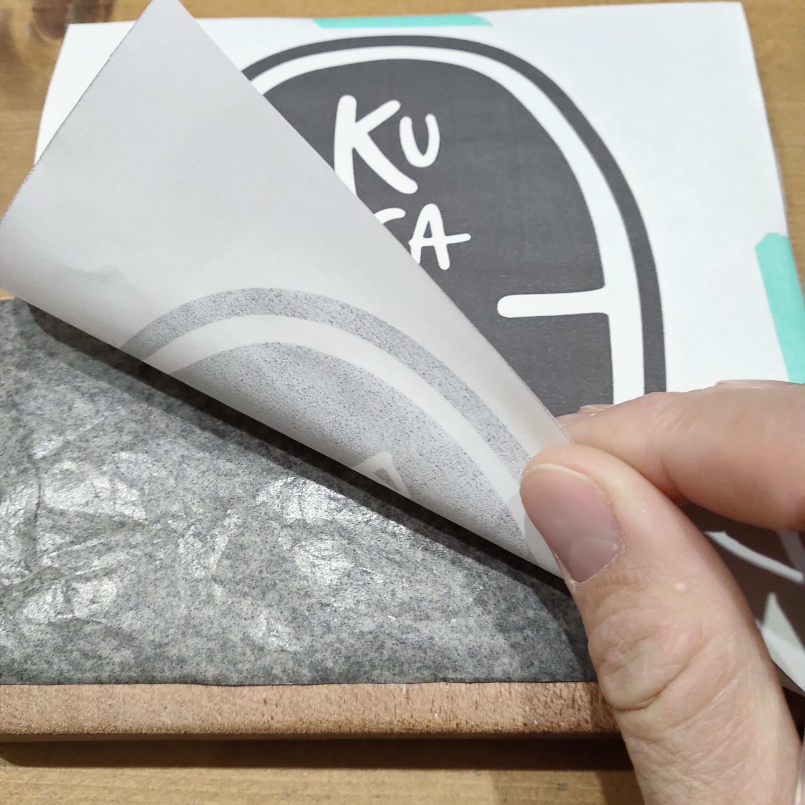 カーボン紙を袋から取り出すと、真っ黒な面とグレーの面があることがわかります。真っ黒な面が下側、つまり木に当てるようにカーボン紙を木の上に乗せます。